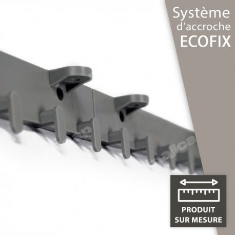 Le système de fixation "Ecofix" est livré en modules de longueurs env. 600mm dans le matériau sélectionné. Le polypropylène (plastique dur, semi-rigide, et très résistant) est recommandé pour les ouvertures à trafic modéré principalement "piétons". La version en aluminium est réservée à un usage plus intensif comme, par exemple, les passages de chariots élévateurs. Le système peut être utilisé en extérieur car il ne craint pas la rouille. Notez également que la version en polypropylène est compatible avec le milieu alimentaire.